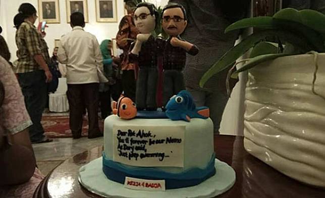 "Dear Pak Ahok, you'll forever be our Nemo. As Dory said, Just keep swimming," bunyi tulisan di kue itu.