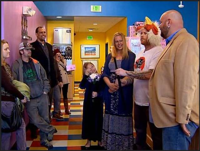Apa rasanya menikah di sebuah toko donat? Voodoo Doughnut, toko donat yang berada di Portland, Oregon, telah menikahkan lebih dari 300 pasangan sejak beberapa tahun lalu. Semua karena paket pernikahan yang ditawarkan.