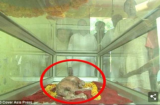Bangkai sapi ini ditempatkan di sebuah kotak kaca. Dari video yang beredar, warga mengantre hanya untuk meletakkan bunga, lalu menunduk sambil berdoa di hadapan sapi ini. Bahkan, warga merencanakan untuk membangun kuil khusus di tempat tersebut.